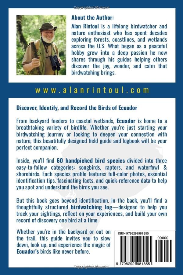 Authored by passionate birder Alan Rintoul, who has spent years exploring Ecuador’s Andes, Amazon, coast, and islands, this guide helps you identify, appreciate, and document 60 of the country’s most iconic and unforgettable bird species.
